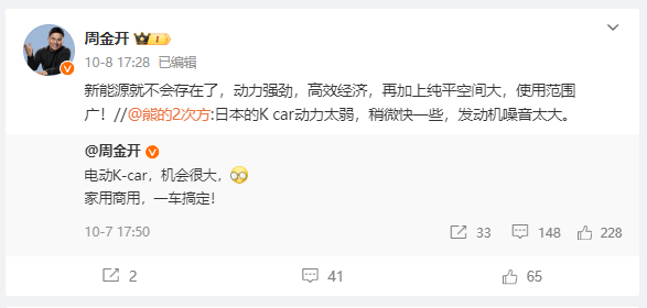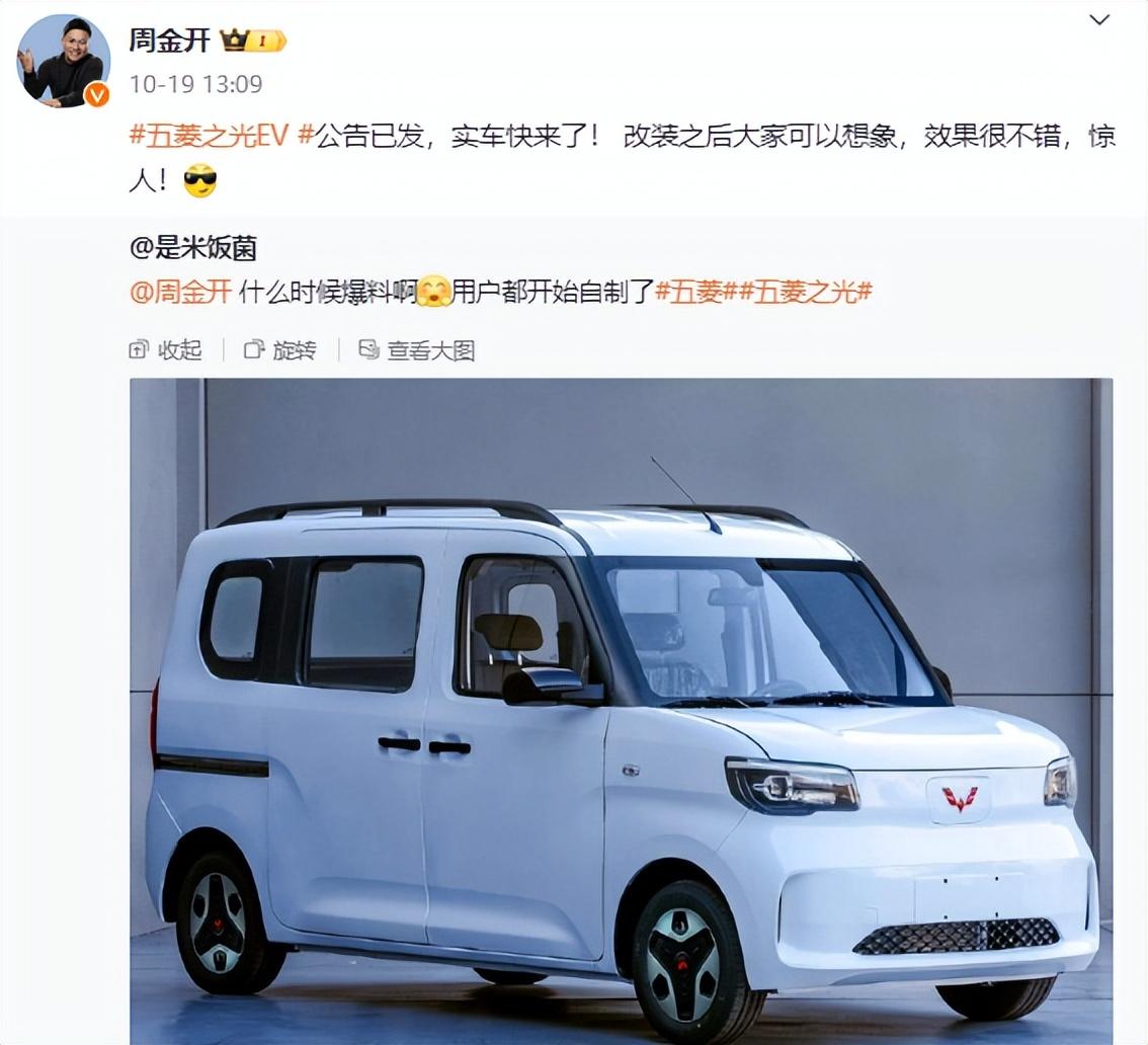 這一問題,上汽通用五菱高管周金開,貌似已經(jīng)給了咱們回答。因?yàn)椋芙痖_曾在社交平臺(tái)發(fā)文,稱“電動(dòng)K-car機(jī)會(huì)很大,家用商用,一車搞定”。