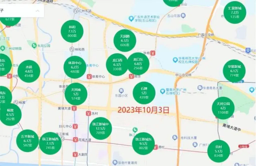 大家可以看到,在去年10月的時候,廣州樓市的珠江新城中板塊房價是在12.5萬,而等到現在,只有9.7萬了,跌沒了28000元,跌幅都超過了20%了,還有廣州樓市的天河南板塊房價從5萬跌至了4萬,跌沒了10000元,跌幅也是在20%了。