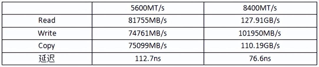 為了讓大家可以比較清晰地對內(nèi)存在8400MT/s下的性能表現(xiàn)有所了解,我們引入了酷睿Ultra 9 285K默認5600MT/s頻率下的性能。從性能對比可以看到,當內(nèi)存頻率提升到8400MT/s之后,其性能得到了非常明顯的提升:Read性能從81755MB/s提升到了127.91GB/s,Write性能從74761MB/s提升到了101950MB/s,Copy性能從75099MB/s提升到110.19GB/s,延遲從112.7ns下降到了76.6ns。可以看到頻率的大幅提升,讓內(nèi)存性能得到了全方位的增長,相信在各種應(yīng)用中都有更好的性能表現(xiàn)。