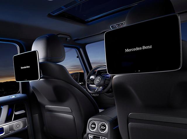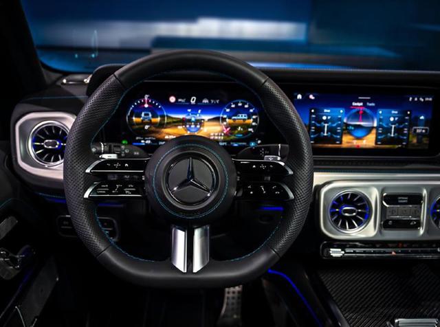 內(nèi)飾的整體布局也沒有太大的改變,大面積真皮材質(zhì)的360°全包裹,再加上菱形的手工縫線和碳纖維材質(zhì)飾板的點綴,還加入了奔馳高端車型的雙聯(lián)大屏,帶有觸控功能的最新一代 Nappa 皮質(zhì)多功能方向盤、環(huán)境氛圍照明系統(tǒng)、Burmester® 3D 環(huán)繞立體聲音響系統(tǒng)、MBUX后排娛樂系統(tǒng),提供了2塊11.6英寸的高清觸控多媒體顯示大屏,為后排乘客在旅途中提供了更加豐富多彩的娛樂音影體驗。全新奔馳G級電動配備“數(shù)字越野座艙”界面和全新的“實時越野路面影像”功能,能夠?qū)崟r獲取越野信息和路面情況。配備了前四后二個飛機渦輪式空調(diào)出風(fēng)口設(shè)計,并保留了奔馳G級獨有的3把銀色金屬差速鎖按鈕,全系新增了全新的電氣化動力系統(tǒng)。G-ROAR模擬聲浪則為電動G級帶來了獨特的聽覺體驗。