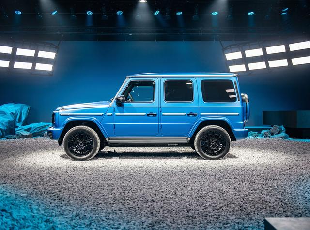 在整車最直觀的顏值設(shè)計層面,奔馳純電G級的外觀沒有給我們帶來太多驚喜,依舊保留了最純正的方盒子造型設(shè)計,將最原始的德國軍車風(fēng)格完整的保留了下來。前臉的設(shè)計更加方正,微微隆起的前艙蓋兩側(cè)配備了與時俱進(jìn)的防空燈設(shè)計,黑色的前格柵與兩側(cè)大燈融為一體,格柵邊框采用了可發(fā)光的設(shè)計,兩側(cè)大燈也加入了正圓形光環(huán)LED光帶,經(jīng)典圓頭大燈升級為幾何多光束LED大燈,其中84個高性能LED獨立光源,具備自動調(diào)節(jié)亮度和遠(yuǎn)近光功能。正中央的虎頭奔車標(biāo)也被保留了下來,多橫幅式的銀色裝飾條中網(wǎng)也顯得更有質(zhì)感。粗獷的前保險杠向前凸出,兩側(cè)對稱的四邊形導(dǎo)流槽和中間的梯形進(jìn)氣口都加入了網(wǎng)格狀黑色鏤空中網(wǎng),底部還加入了金屬護(hù)板,看上去依舊威風(fēng)凜凜。