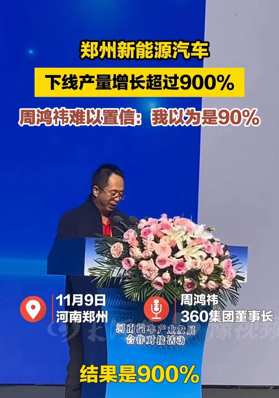 11月8日晚,河南汽車產業發展合作對接活動在鄭州舉行,鄭州前三季度新能源汽車下線產量增長迅速,下線產量增長超過900%,360集團董事長周鴻祎:"我以為是90%,結果是900%,潛力巨大!"中國品牌汽車的崛起已經勢不可當。