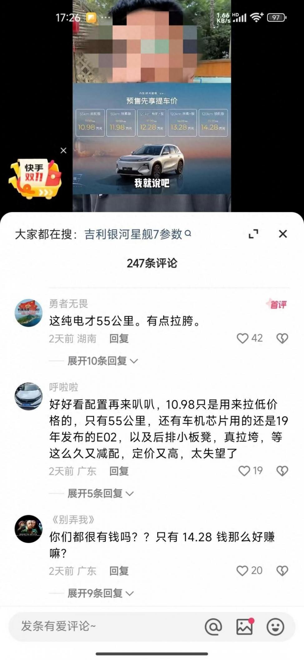 汽車自主品牌中,吉利汽車絕對是市場很敏感的車企,只要是市面上熱銷的車型,吉利汽車都會推出對應的車型來競爭,比如說熊貓mini對標五菱宏光miniev,帝豪L 雷神Hi·P當時對標比亞迪秦PLUS DM-i等,如今吉利終于又推出一款針對比亞迪宋pro dmi的SUV,并且預售價直接拉低到10.98萬元,在正式上市后,估計售價會更低,這款車就是最近網上很火的吉利銀河星艦7 EM-i,不少車評人對這款車好評如潮,然而如今網友卻人間清醒,那么這款車到底值得入手嗎?