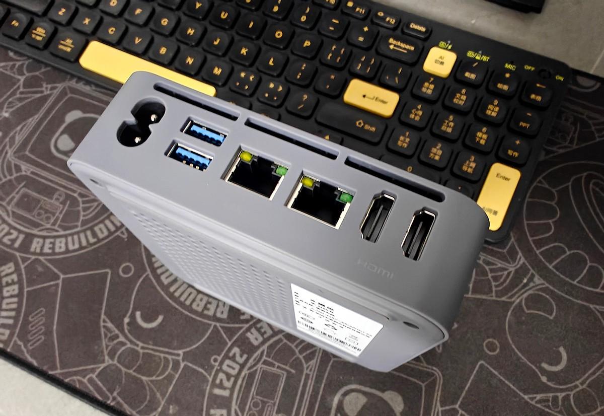 背面的接口就更多了,首先兩個(gè)千兆網(wǎng)口就足夠滿足很多辦公網(wǎng)絡(luò)需求了,同時(shí)它還有兩個(gè)HDMI接口,最大支持4K 60Hz輸出,背面同樣有兩個(gè)USB3.2接口,日常使用是足夠了。而最邊上的8字電源口則是內(nèi)置了電源的結(jié)果,只需要一條線就可以供電,再也不用那種大大的電源適配器了。