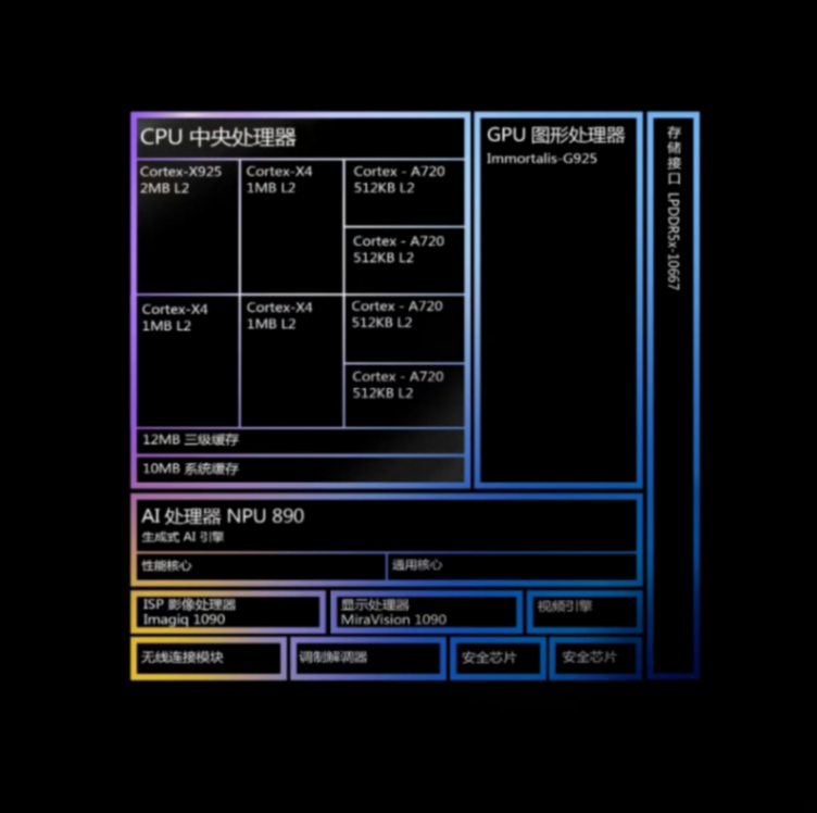 驍龍8至尊版:性能全面升級驍龍8至尊版作為高通最新的旗艦SoC,其性能提升顯著。它放棄了以往使用的ARM架構,首次在移動平臺上引入了高通自研的Oryon架構,采用“2+6”八核設計,包括2個4.32GHz超級內核和6個3.53GHz性能內核。這種設計使得單核和多核性能相比前代產品提升高達45%,同時功耗降低了44%。在GPU性能上,驍龍8至尊版搭載的Adreno GPU引入了切片架構,配備三個頻率為1.1GHz的獨立GPU切片,顯著提升了能效,并配有12MB專屬圖形內存,有效減少對系統內存的依賴。官方稱GPU整體性能提升40%,功耗降低40%,光追性能提升35%。