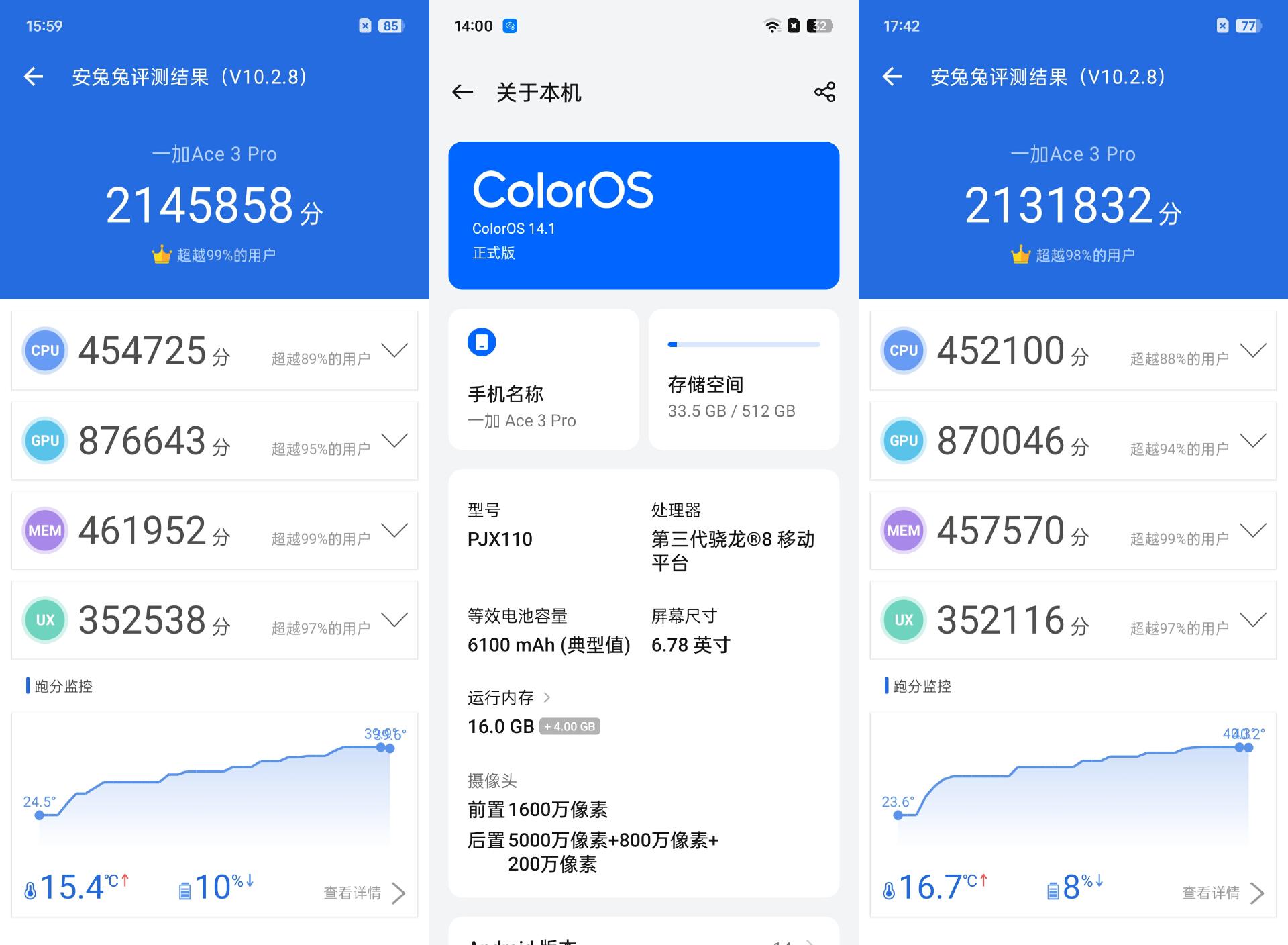 一加Ace 3 Pro的性能配置放到現在依然算是能打的,搭載了高通驍龍8Gen3旗艦級移動處理器+滿血版LPDDR 5X運存+UFS 4.0閃存,還額外配備了一顆獨家定制的電競獨顯芯片,不論是用來游戲娛樂還是當做生產力工具都綽綽有余了,體驗非常流暢。