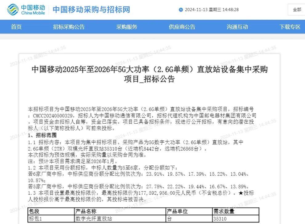 日前,中國移動發布2025年—2026年5G大功率(2.6G單頻)直放站設備集采,項目資金由招標人自籌,資金已落實。該項目己具備招標條件,現進行公開招標。