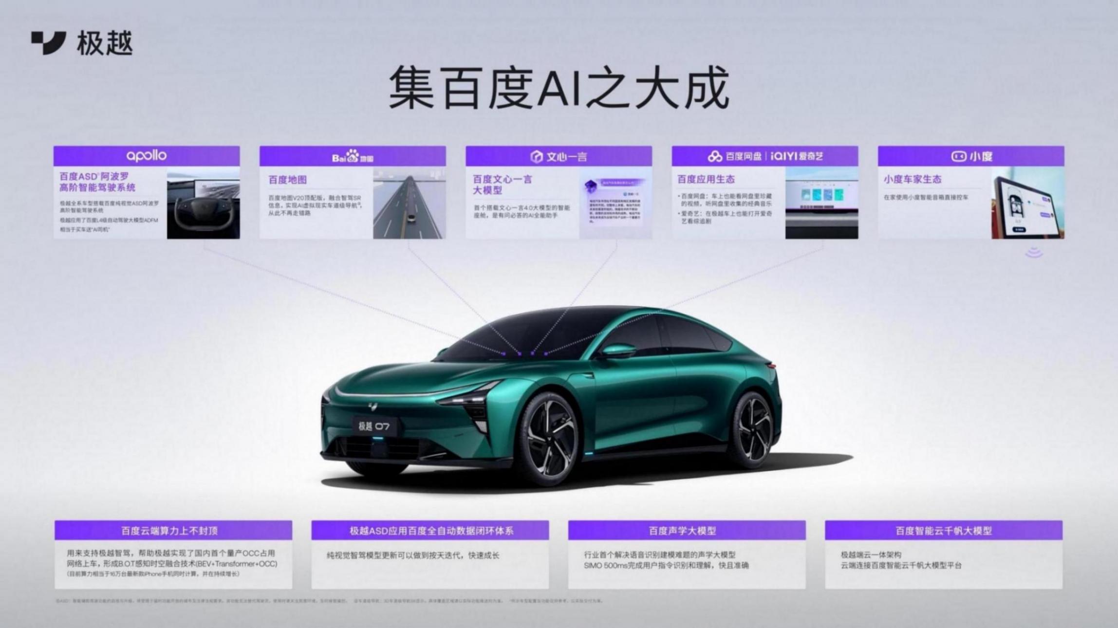 除此之外,現在年輕人看重的就是智能化,極越07的內飾采用了35.6英寸的連屏設計,分辨率達到6K,搭載的是高通驍龍8295P芯片,功能性很強大。所以整個內飾沒有實體按鍵,就連換擋都放在了屏幕里,可見它的智能化有多強,配備了連續語音控制功能,還有面部識別,聲紋識別等等。另外,百度對于極越的加持也為其智能化添色不少。像是百度地圖、百度純視覺ASD阿波羅高階智駕、百度文心一言大模型座艙、百度網盤、小度車家生態等等,進一步增加了極越07在智能化上的優勢。