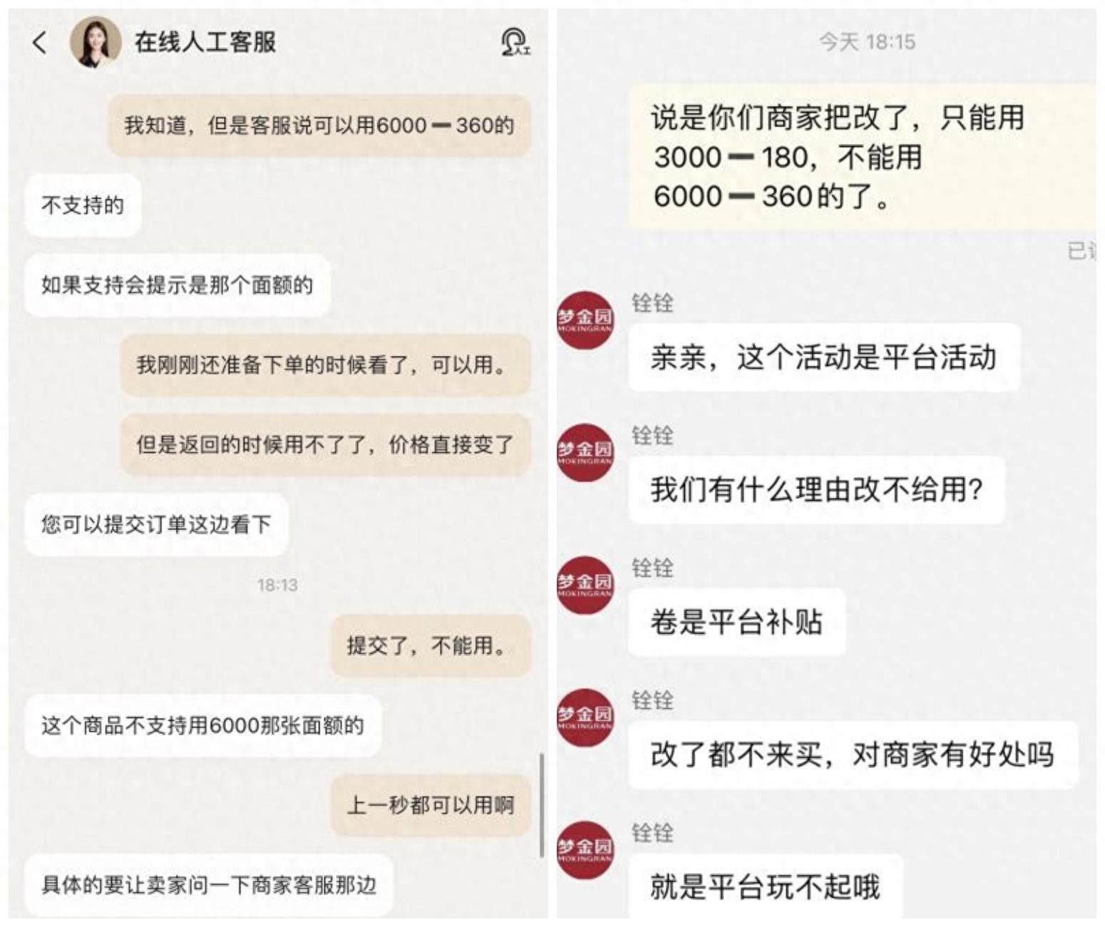 隨后該消費者向淘寶平臺以及“夢金園”商家的客服反映前述情況,而淘寶客服回復稱是此商品不支持使用相關購物券,并讓消費者“問一下商家客服那邊”;“夢金園”店鋪的客服卻表示“是平臺玩不起”,堅稱是淘寶平臺不給使用該購物券。