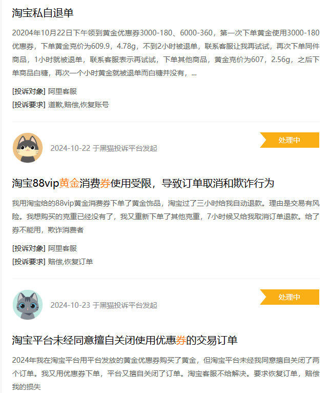 與此同時,黑貓投訴平臺上,還有消費者反映稱,“雙十一”期間在“夢金園”店鋪使用黃金購物券下單后,被無故強制性退單。除了“夢金園”店鋪,其他店鋪也有類似情況,在“雙十一”期間,多名消費者接連投訴領取的黃金品類購物券無法正常使用,或是使用該購物券下單后卻被店鋪無故退單的情況。