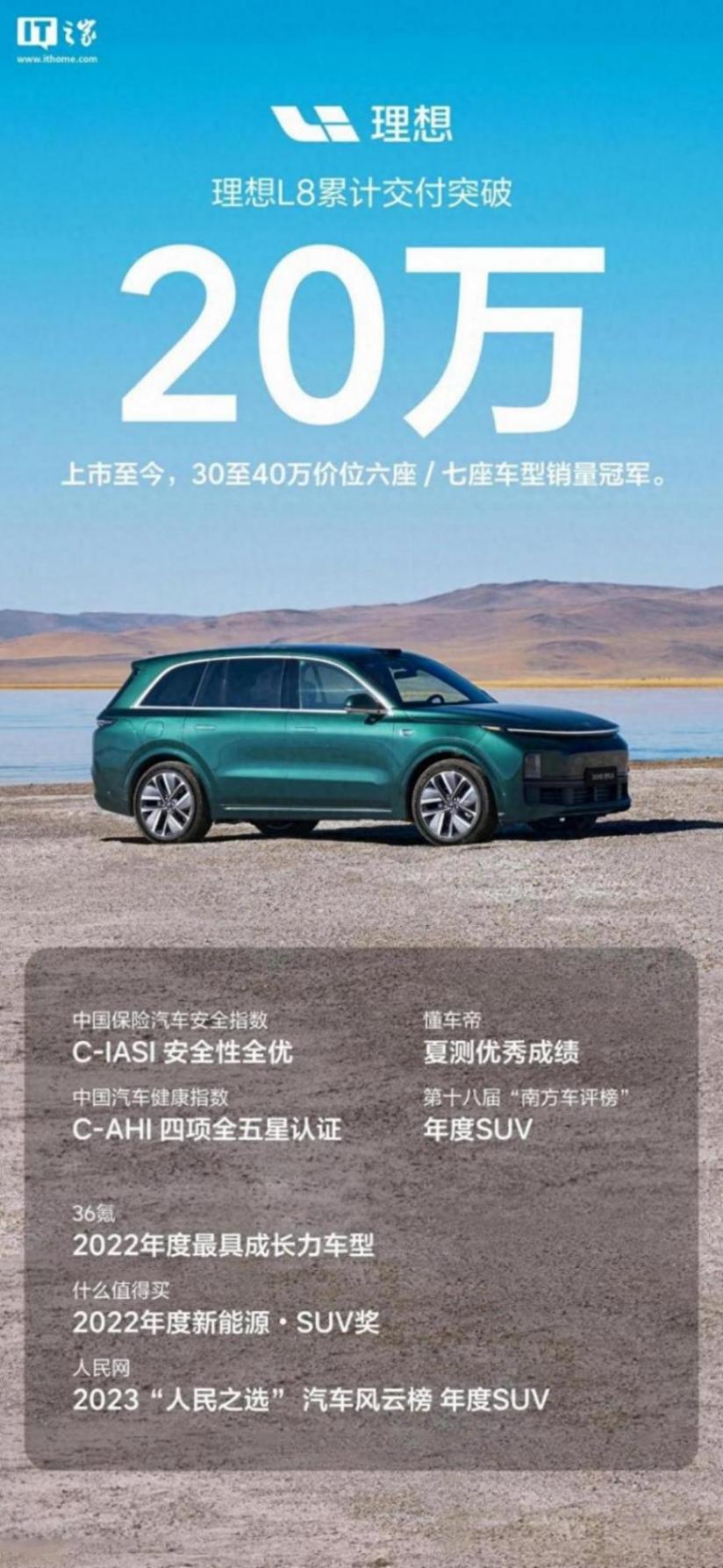 11 月 15 日消息,理想汽車今天上午宣布,理想 L8 累計(jì)交付突破 20 萬(wàn)臺(tái),上市至今取得了 30 至 40 萬(wàn)價(jià)位六座 / 七座車型銷量冠軍。