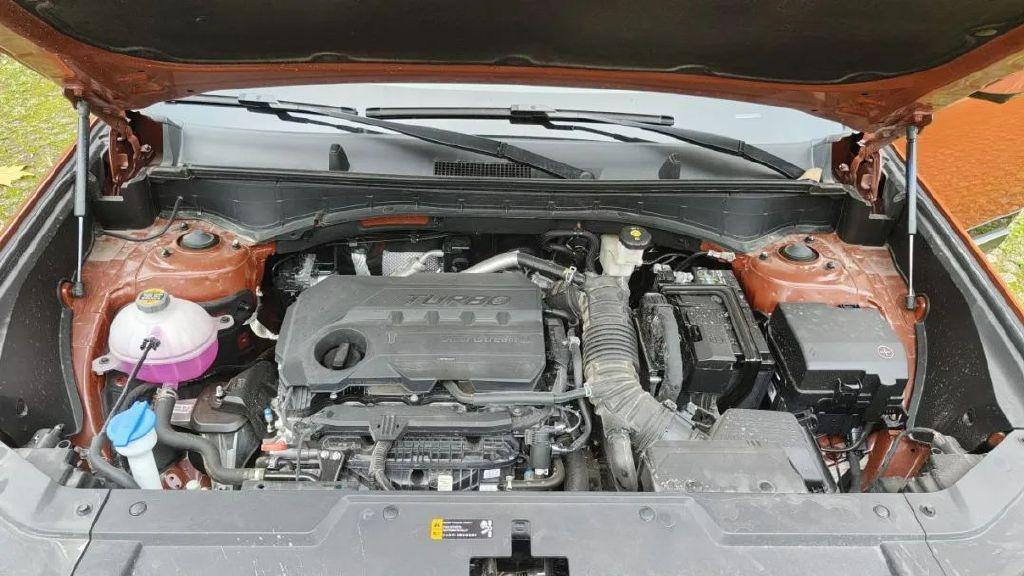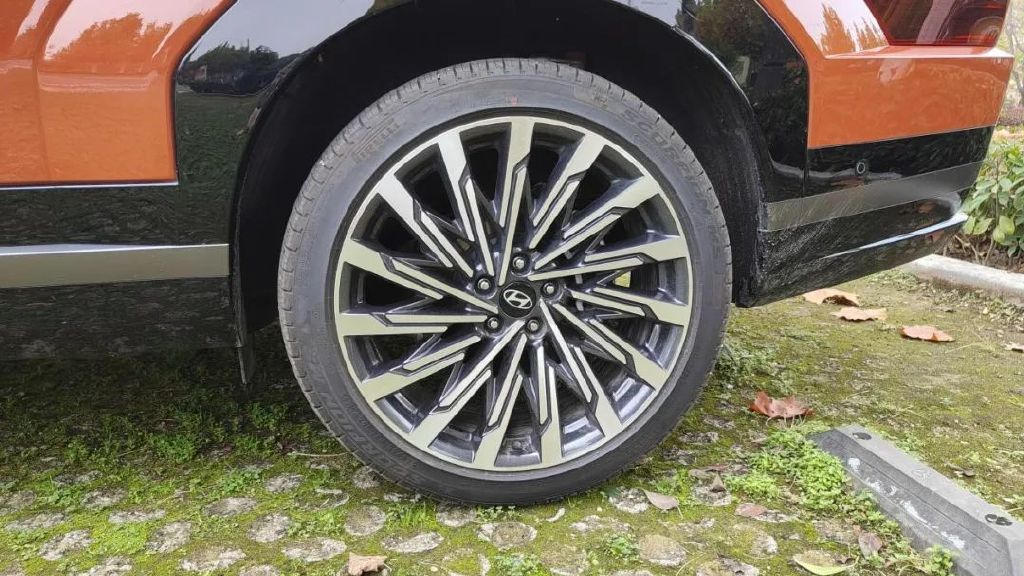 今天我們試駕的是高配版本,其車底設置了21英寸銀黑雙色多幅式的輪圈,并且搭配倍耐力蝎子系列輪胎,具體規格為245/45 R21。這是一款專為SUV設計的四季胎,可為車輛提供不俗的抓地力,并且在胎噪控制和耐磨方面有著不錯的表現。