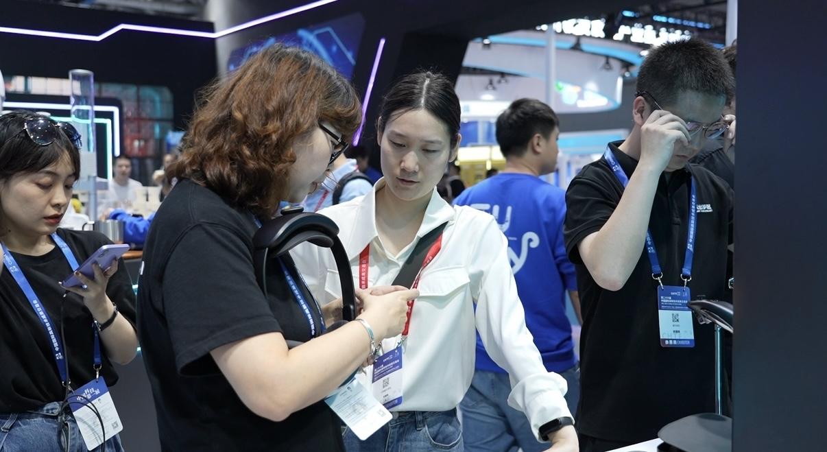 在“AI+消費”區域,深圳市億家億伴智能科技有限公司帶來了一款奶龍AI玩伴機器人,目標是陪伴3-10歲兒童快樂成長。據工作人員介紹,這款機器人是粵港澳大灣區數字經濟研究院(IDEA研究院)的產業化項目,將人工智能巧妙地融入家庭育兒場景。此外,玩出夢想帶來自主研發并于今年6月全球發布的全球首款安卓系統空間計算玩出夢想MR,通過自研算法,實現全球領先的14ms彩色VST延遲以及眼手語音手柄多模態融合交互。該公司運營負責人王振表示,目前該產品已運用到埃及金字塔、河南風氣洛陽等文旅IP場景的開發中。
