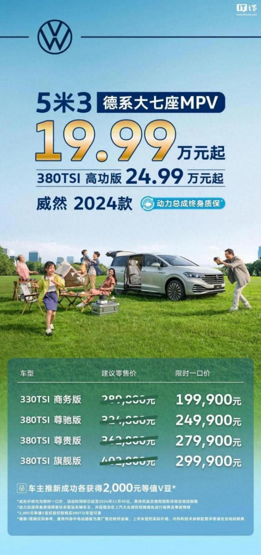 11 月 15 日消息,在今天的廣州車展期間,上汽大眾宣布大七座 MPV 車型威然限時降價,一口價 19.99 萬元起。