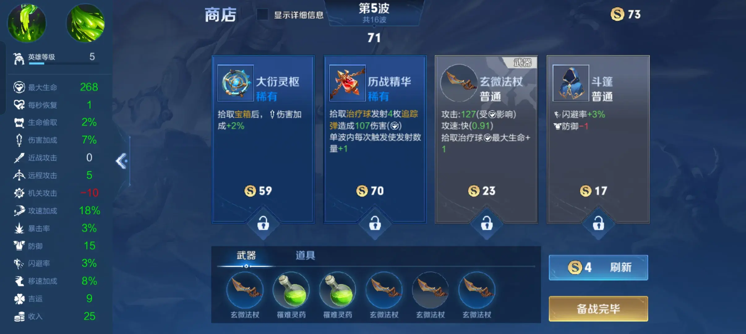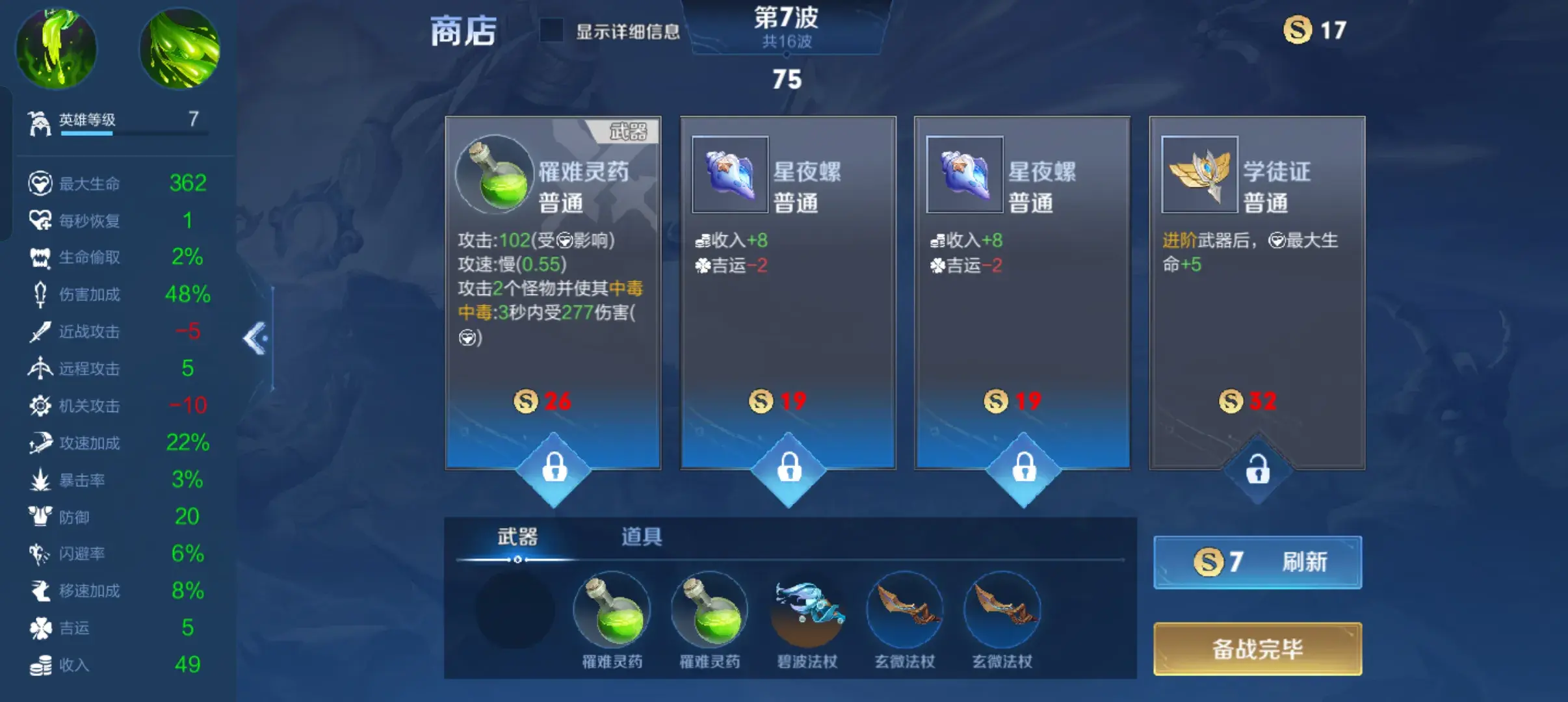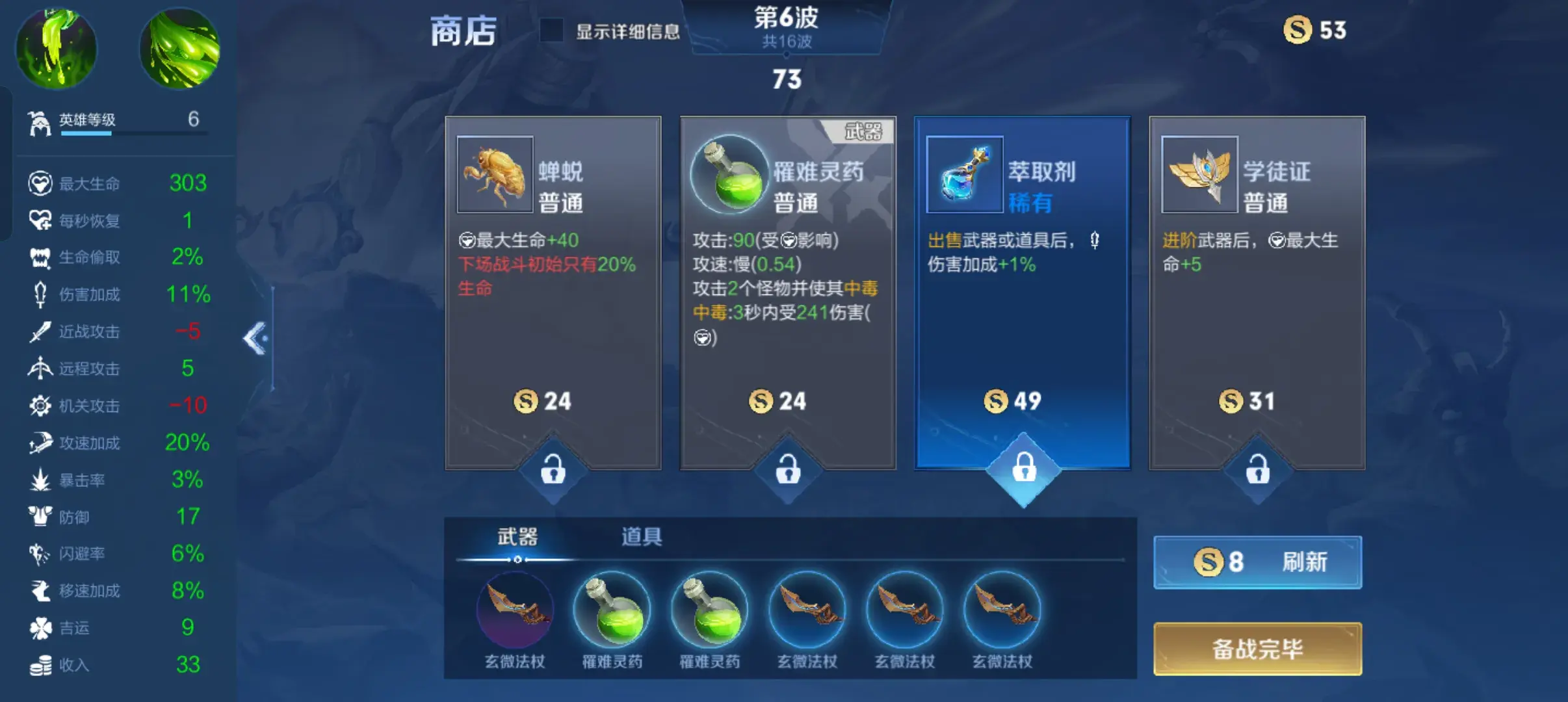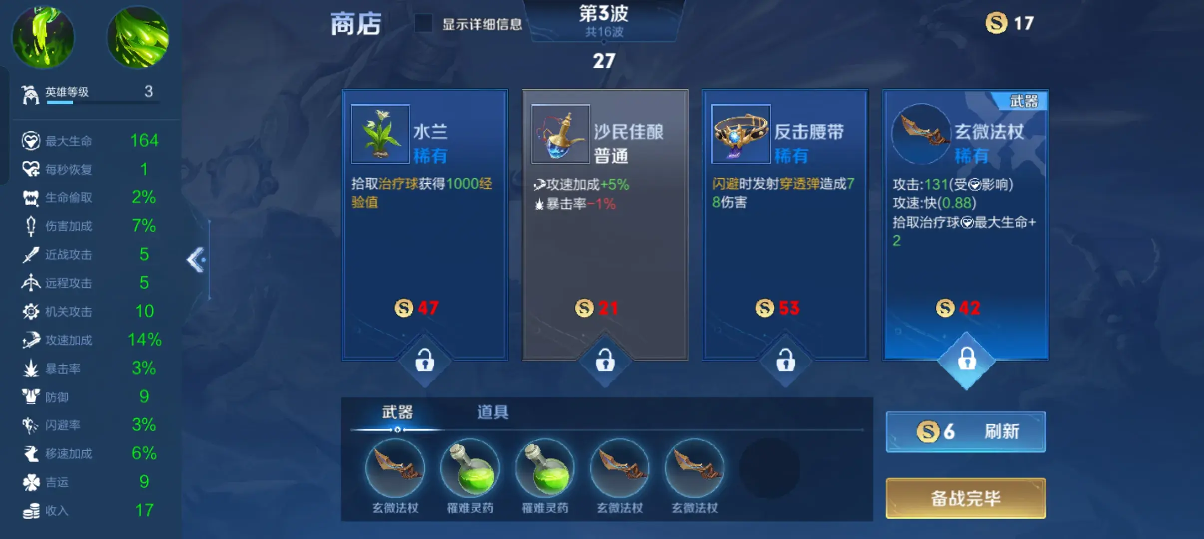 武器主拿玄微法杖和毒瓶,刷到加收入直接入不用管,加金幣才是王道,金幣不夠有合適的武器道具記得及時鎖起來下次就還在
