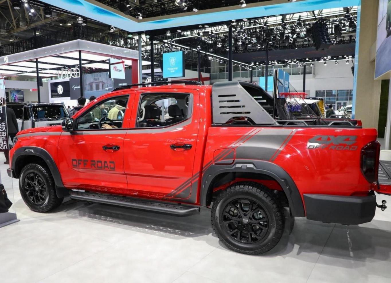 車身側面部分的造型有著猛禽的既視感,車頂有著熏黑行李架來增加越野定位,而且車門部分還有著整體外擴的造型來提升厚重感,輪眉部分則是外擴式的造型設計,結合突出的熏黑飾板設計,讓新車的越野氛圍更加濃郁,后貨箱部分的熏黑防滾架,以及多幅式的大尺寸熏黑輪轂,再結合寬厚的腳踏板,整體看起來很炫酷。車身尺寸方面,長寬高分別為5530(5845)/1960/1873毫米,軸距為3165(3480)毫米,標箱版貨箱長寬高為1485/1510/530毫米,長箱版貨箱長寬高為1800/1510/530毫米,大尺寸車身讓新車看起來硬朗且霸氣。
