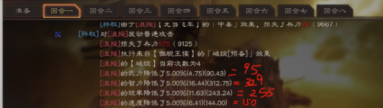 舉個(gè)栗子:咱們來看下下面這組數(shù)據(jù),就能看到沮授的厲害之處,初始智力329第一回合沮授被打中普攻降低5%,被命中五次后為197,再結(jié)算34%之后變成了135??傆?jì)降低百分率58.9%。(我這還是白板許攸的數(shù)據(jù),如果滿紅估計(jì)能降65%以上)這數(shù)據(jù)是按百分率算的,就太可怕了。加之受到5次普攻之后受到傷害提高25%左右,真的就是滿紅直接變得白板不如。如果你是白板,那就變?cè)恕?/p>