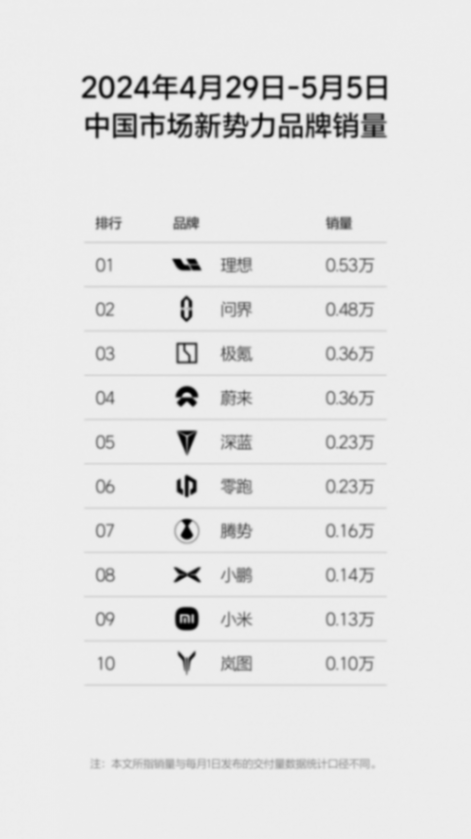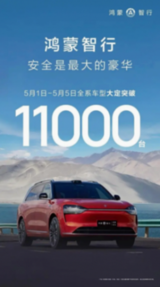和理想汽車最具競爭關系的問界,雖然最新一周的銷量成績不及理想,5月第一周的成績為0.48萬輛。但在五一期間,包括問界在內的鴻蒙智行累計新增訂單約為1.1萬臺。