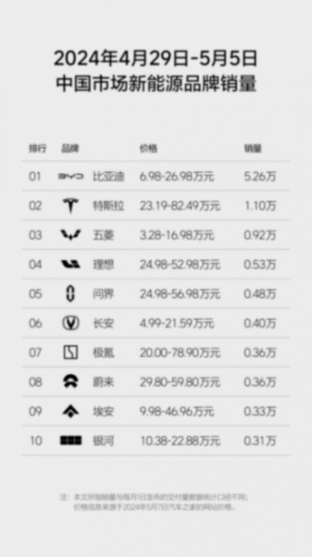 從榜單來看,比亞迪仍然是新能源市場無可撼動的銷量冠軍,5月第一周,比亞迪周銷量成績為5.26萬臺,依然是“斷崖式”遙遙領先。
