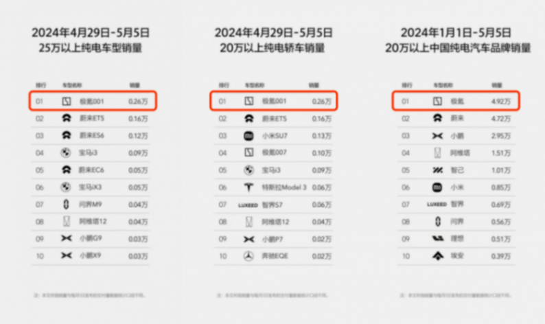 值得注意的是,在4月29日-5月5日的銷量榜單中,無論是“25萬以上純電車型銷量”、“20萬以上純電轎車銷量”、還是“1月1日-5月5日”20萬以上中國純電汽車品牌銷量”三大銷量排行榜單上,極氪均位居第一!可見極氪無論實在新勢力、新能源、純電還是豪華車維度,銷量表現都非常亮眼。