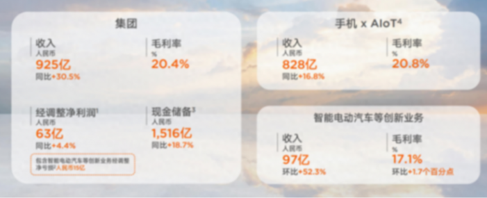 11月18日晚間,小米集團披露2024年三季報,期內實現營收925億元,同比增長30.5%,創下歷史新高;經調整凈利潤為63億元,同比增長4.4%,其中包含智能汽車等業務15億元的凈虧損。該季度小米集團整體毛利率為20.4%,同比下滑2.3個百分點。