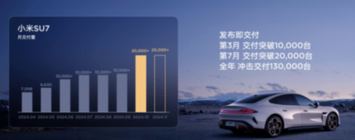 今年10月,小米汽車工廠單月生產量及新車交付量均破2萬輛,11月13日Xiaomi SU7第10萬臺整車完成下線,提前完成10萬臺交付目標。