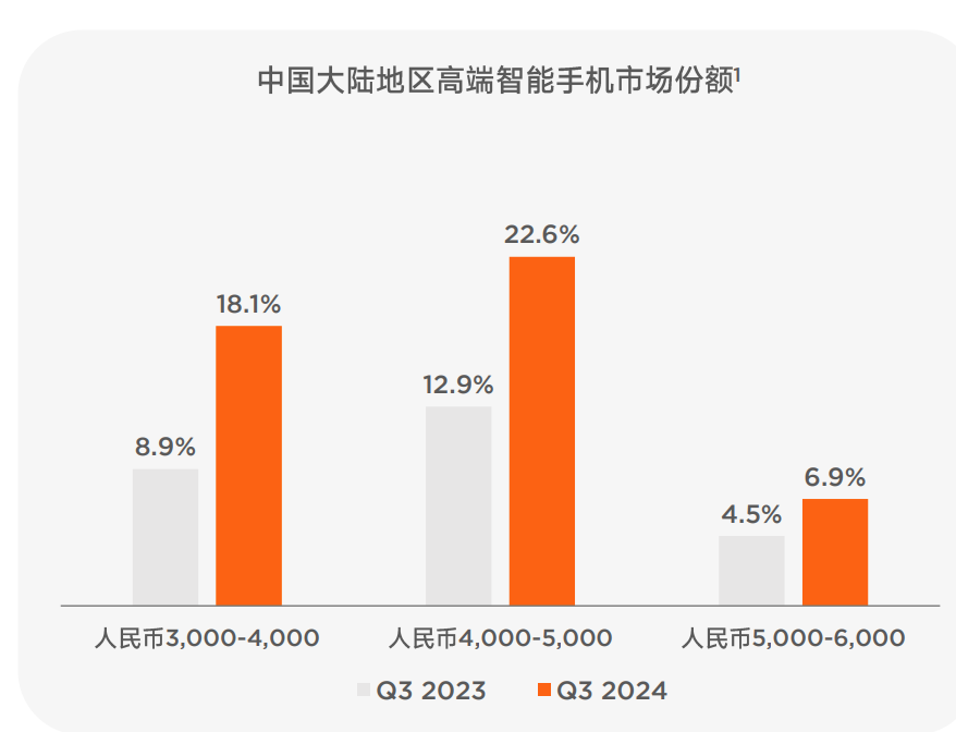 財報披露,今年三季度,小米在中國3000-4000元價位段手機市場的份額為18.1%,同比提升9.2個百分點,在4000-5000元價位段的份額為22.6%,同比提升9.7個百分點,而在5000-6000元價位段的份額為6.9%,同比提升2.1個百分點。