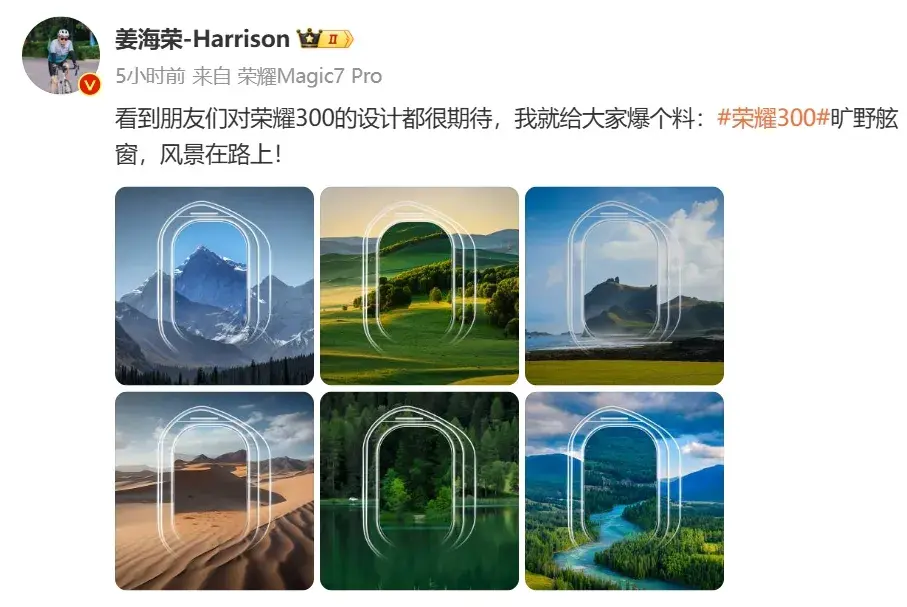 今天,榮耀終端有限公司中國區CMO姜海榮發博曝光了榮耀300系列相機模組設計為“曠野舷窗”,跟虞書欣曝光的手機一致。那么問題來了,大家會給這個設計打幾分呢?