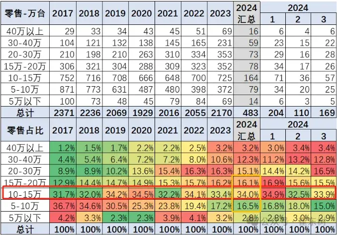 按價格區分的細分市場,10-15萬的占比高達34%。