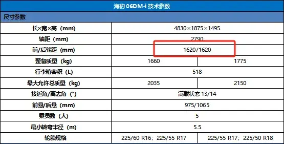 很多人忽略了車身參數中前后輪距,一個決定車內橫向空間和操控基礎的指標。軸距固然重要,畢竟它會確定車輛的縱向空間。軸距達到2790mm的海豹06DM-i也已經足夠保障車內空間。但是,在高度相差不多的情況,前后輪距更大,不僅能直接反映車內橫向空間更足,同時車輛側傾重心也會更低,更有利提升操控。