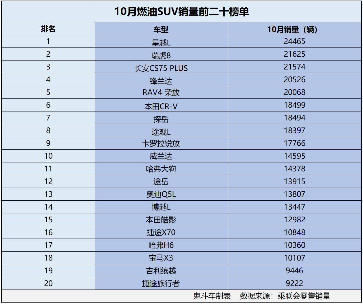 有銷量數據為證,最近,乘聯會發布10月燃油SUV零售銷量數據,鬼哥整理出銷量排名前二十的榜單。從榜單上可以看到,共有18款車型月度銷量過萬,接下來,看看具體車型銷量表現與排名,看看誰是榜單上的贏家?