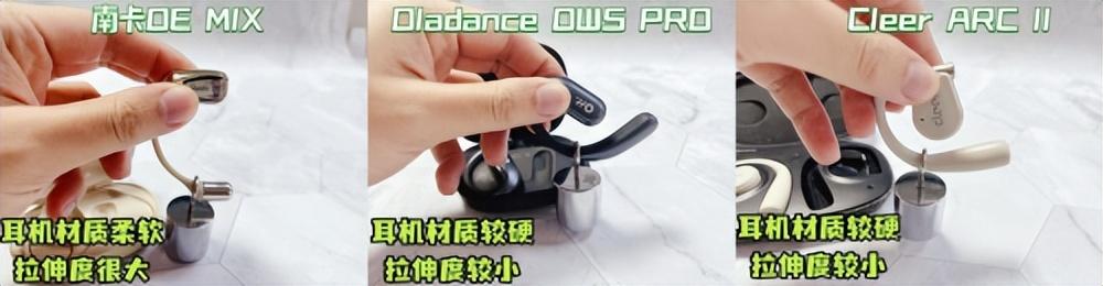 在本次柔韌性測評中,柔韌性最大的耳機是南卡這款oemix,形變程度很大。Cleer和Oladance這兩款耳機的形變程度較小,柔韌性一般。
