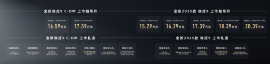 2025款瑞虎9和瑞虎9 C-DM的起售價分別為15.29萬元起、16.59萬元起,當(dāng)前下定即可尊享多重購車禮遇,以更低門檻輕松購車。