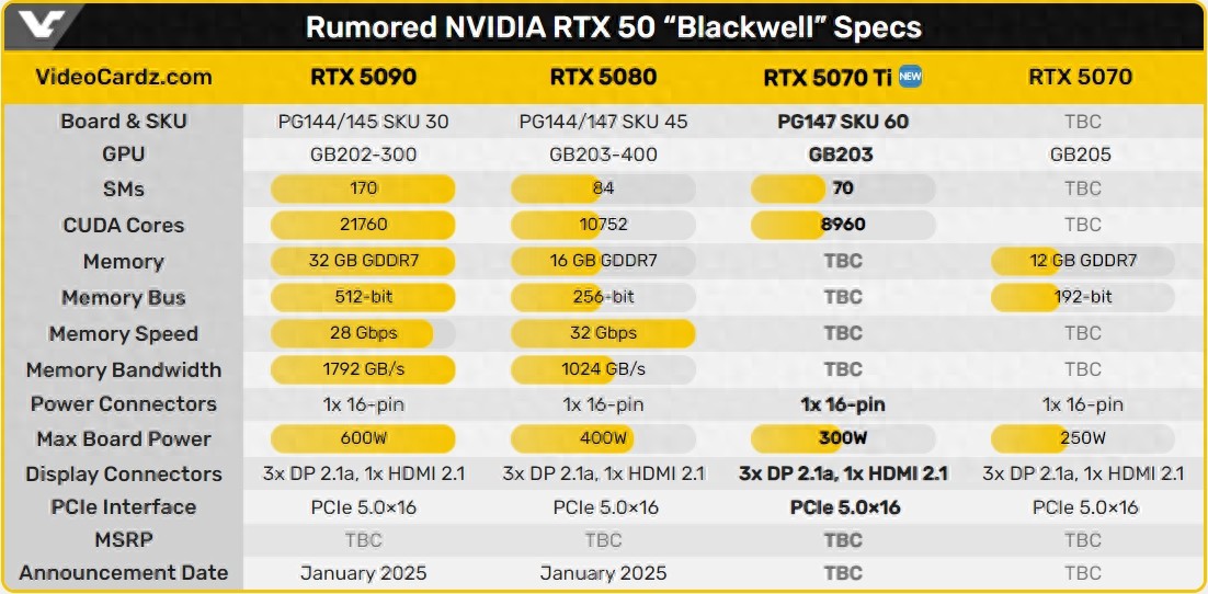 硬件網站Videocardz從消息人士Kopite7kimi處獲悉,5070ti將會采用GB203芯片,配備70個SM陣列、8960個CUDA核心,較4070ti的7680個核心增加了16.6%,并且超過了4070tis的8448個核心6%左右。