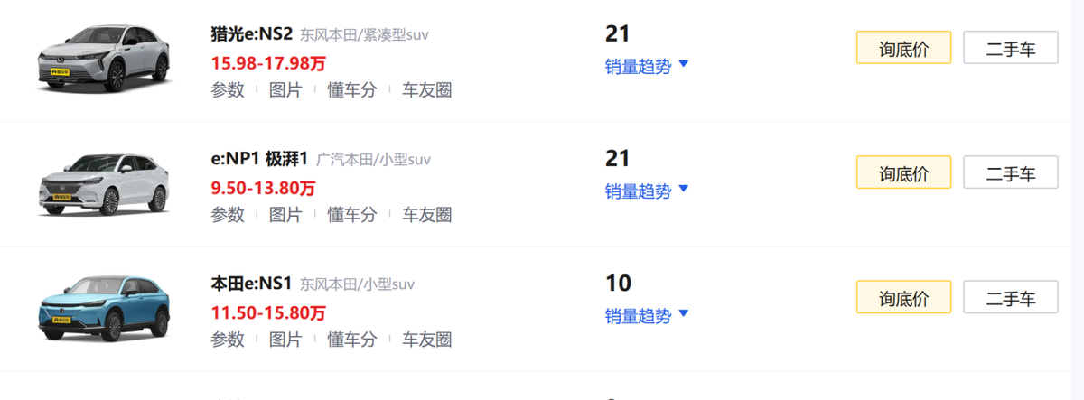 廣汽本田的極湃1和極湃2,今年10月銷量分別僅為21輛和451輛;東風本田的e:Ns1和獵光e:Ns2則更為慘淡,10月銷量僅有10輛和21輛。無論從產品設計還是成本控制來看,這些車型都沒能抓住中國消費者的需求,其市場表現自然一路滑坡。
