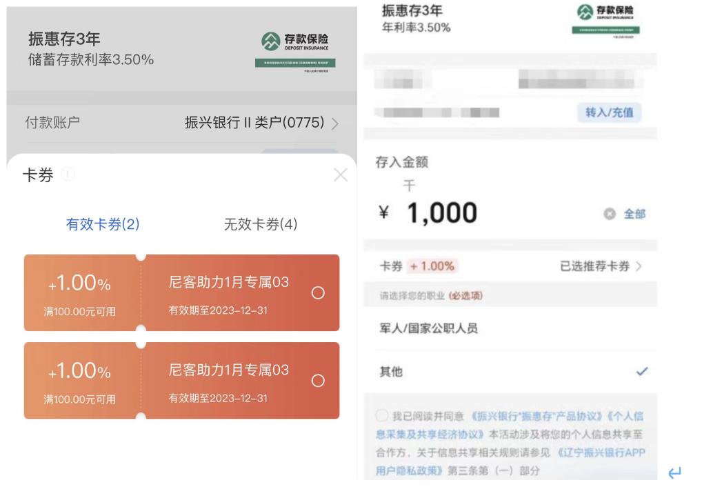 儲戶李琳(化名)2023年陸續購入60萬元振興銀行的存款產品 ,該存款產品在購買頁面可選擇北京尼客科技提供的專屬券加息,選擇后存款利率可在振惠存產品基礎上上浮1%。李琳以此計算,該筆存款3年綜合利率將上浮至4.5%。