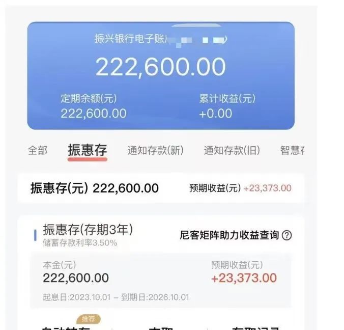記者根據儲戶反饋、公開資料整理,去年,振興銀行通過北京尼客科技開展了多個利息獎勵活動。第一類就是上述針對普通儲戶的活動,在振惠存產品基礎上“加息”0.8%~1%不等,目前大多數此類產品的活動收益已確認暫停。這部分存款的預期收益低于儲戶預期。以300萬元存款3年期為例,儲戶計算后的預期利息為40.5萬元,但后兩年取消加息補貼后,實際利息或為34.5萬元,相差6萬元。