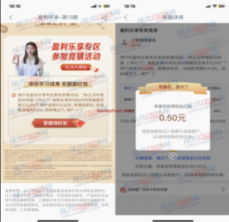 工商銀行我的財富我做主有獎活動,參與答題可以領取0.5元紅包,紅包領取后發放到賬戶余額,一共限量10萬份紅包,大家可以擼下