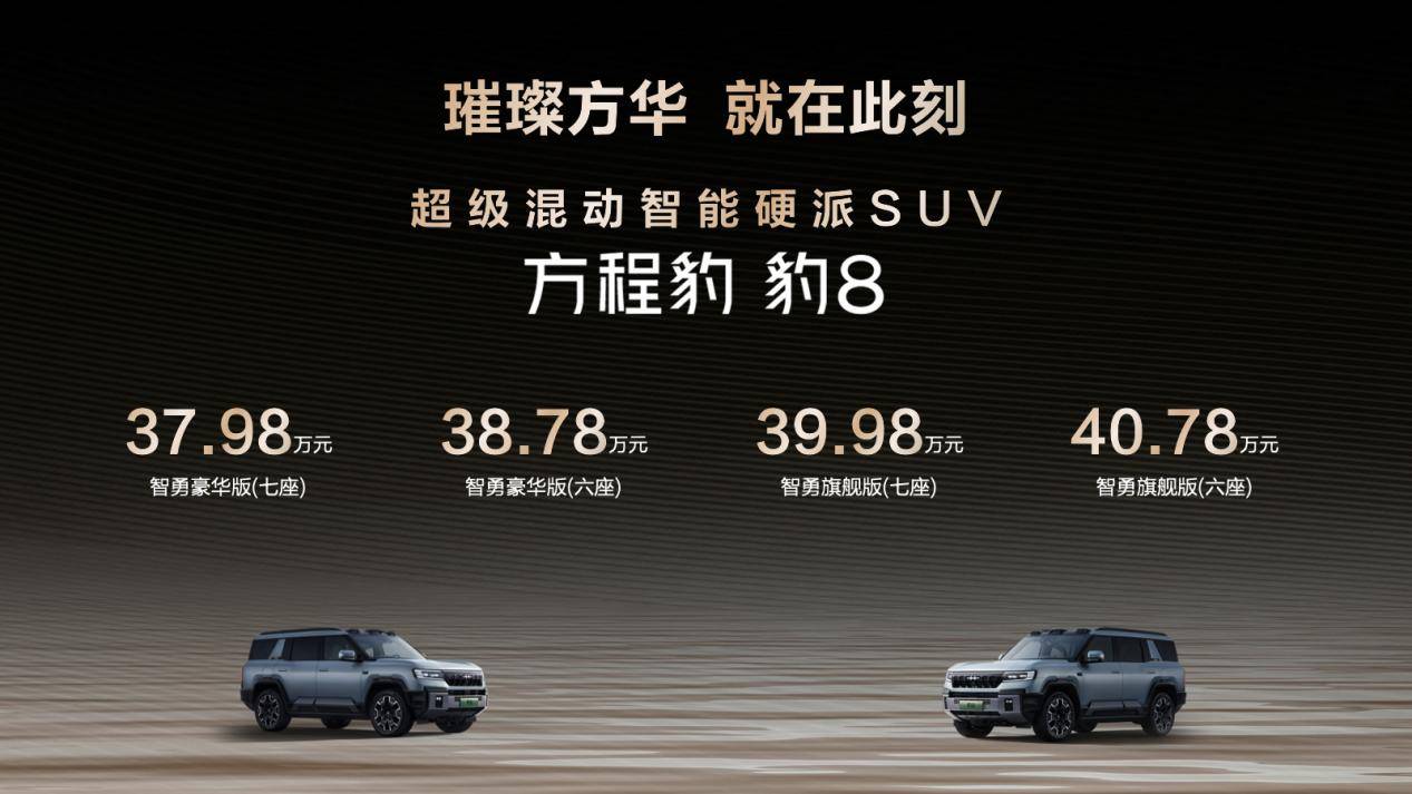 11月12日,比亞迪華為聯(lián)合發(fā)布方程豹豹8上市,共發(fā)布4個款型,其中智勇旗艦六座版40.78萬元、智勇旗艦七座版39.98萬元、智勇豪華六座版38.78萬元、智勇豪華七座版37.98萬元。作為比亞迪30周年的旗艦之作,比亞迪華為首次聯(lián)合開創(chuàng)的智能硬派,豹8定義了國貨旗艦的頂級價值,開創(chuàng)了自己的價值公式——8=4x(1+1)。1臺豹8等于 4大王牌科技,乘以1套全家舒享豪華配置加1個非承載式硬派車身,以“智勇雙全”的非凡實力,開啟全球智能硬派新時代。