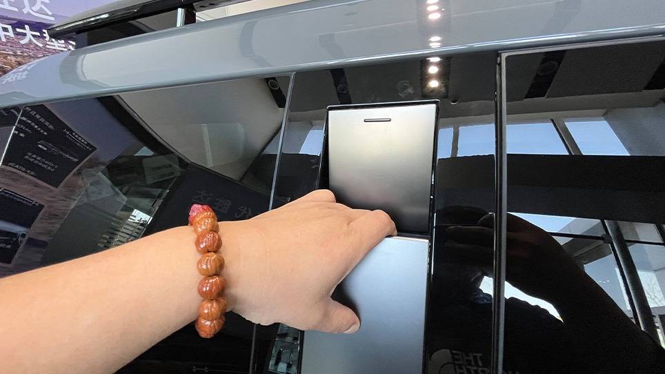 從A柱到D柱全部采用黑色亮面設(shè)計(jì),與黑色隱私車(chē)窗融合為一體,貫穿至車(chē)尾。C柱上設(shè)計(jì)了隱藏式攀巖把手,可承受200公斤的重量,可方便人員輕松攀爬至車(chē)頂。