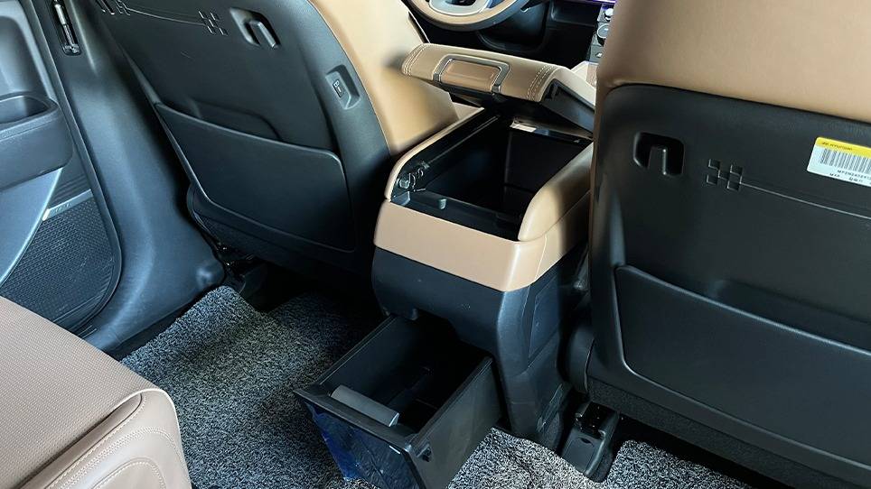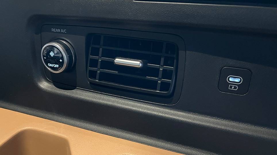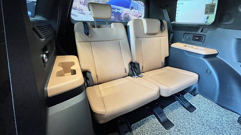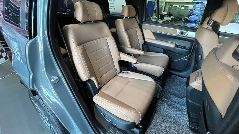 第三排為兩人座,兩側(cè)分別配置了杯托,空調(diào)調(diào)節(jié)旋鈕,充電接口。進(jìn)入第三排時(shí),二排座椅可一鍵移至最前,后排開(kāi)口較大,上下較為方便。