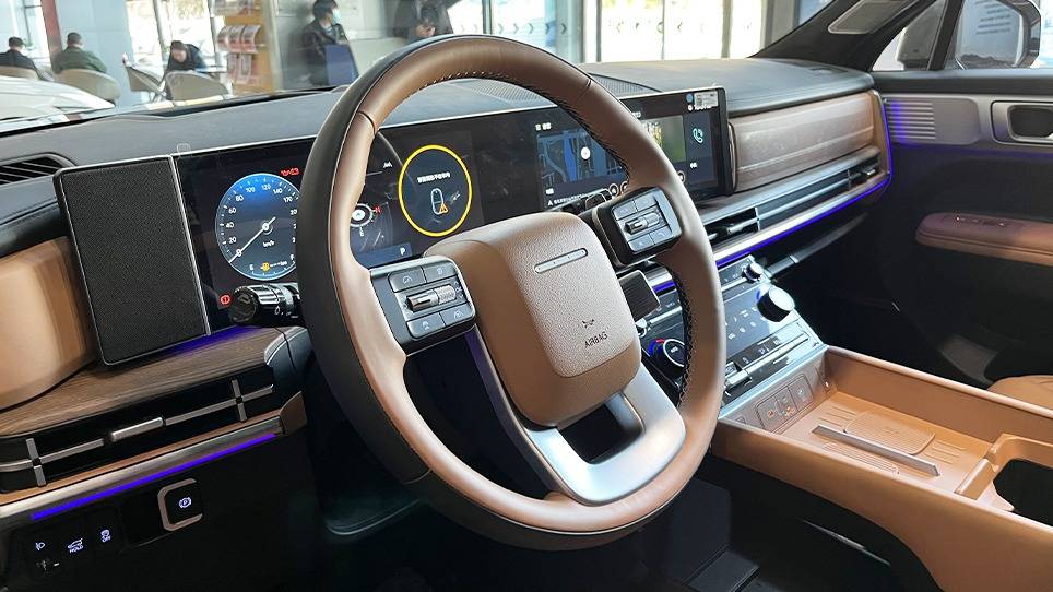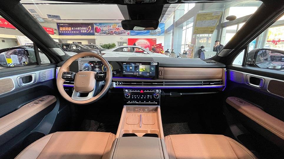 內(nèi)飾用料方面很考究,方向盤(pán)等觸手可及的地方都采用了大量的軟性材質(zhì)覆蓋,觸感細(xì)膩,提升了內(nèi)飾的質(zhì)感。空調(diào)出風(fēng)口和門(mén)板處還采用了木紋飾板進(jìn)行點(diǎn)綴,配合貫穿式氛圍燈,營(yíng)造出了一種高級(jí)而硬朗的座艙氛圍。