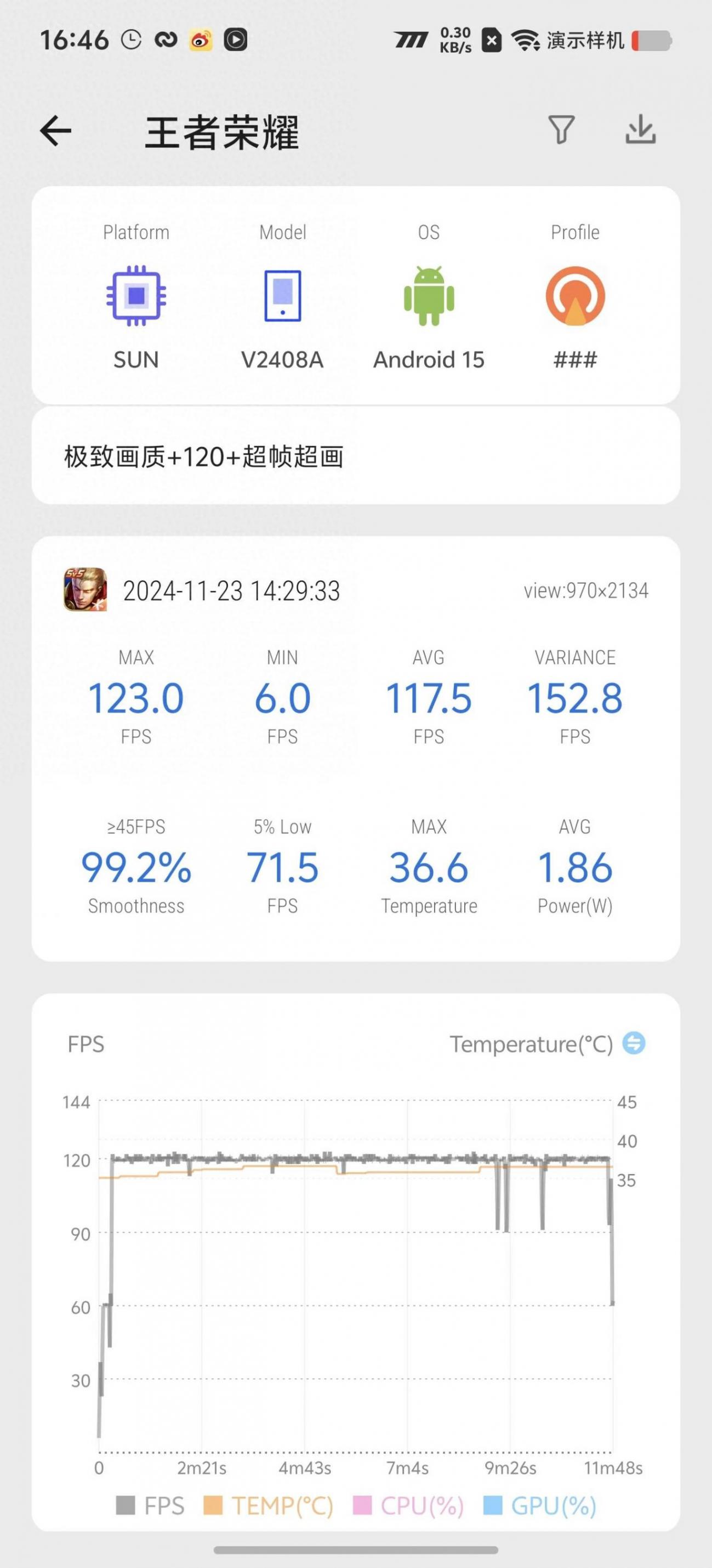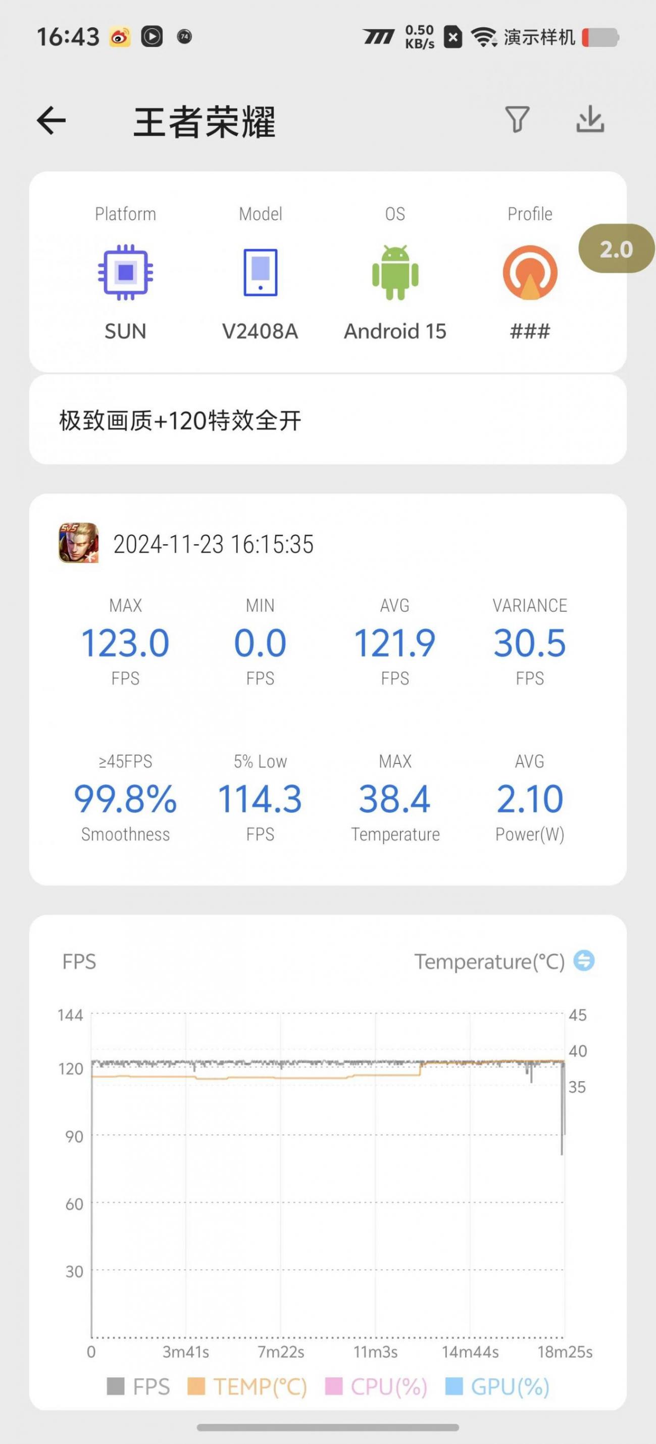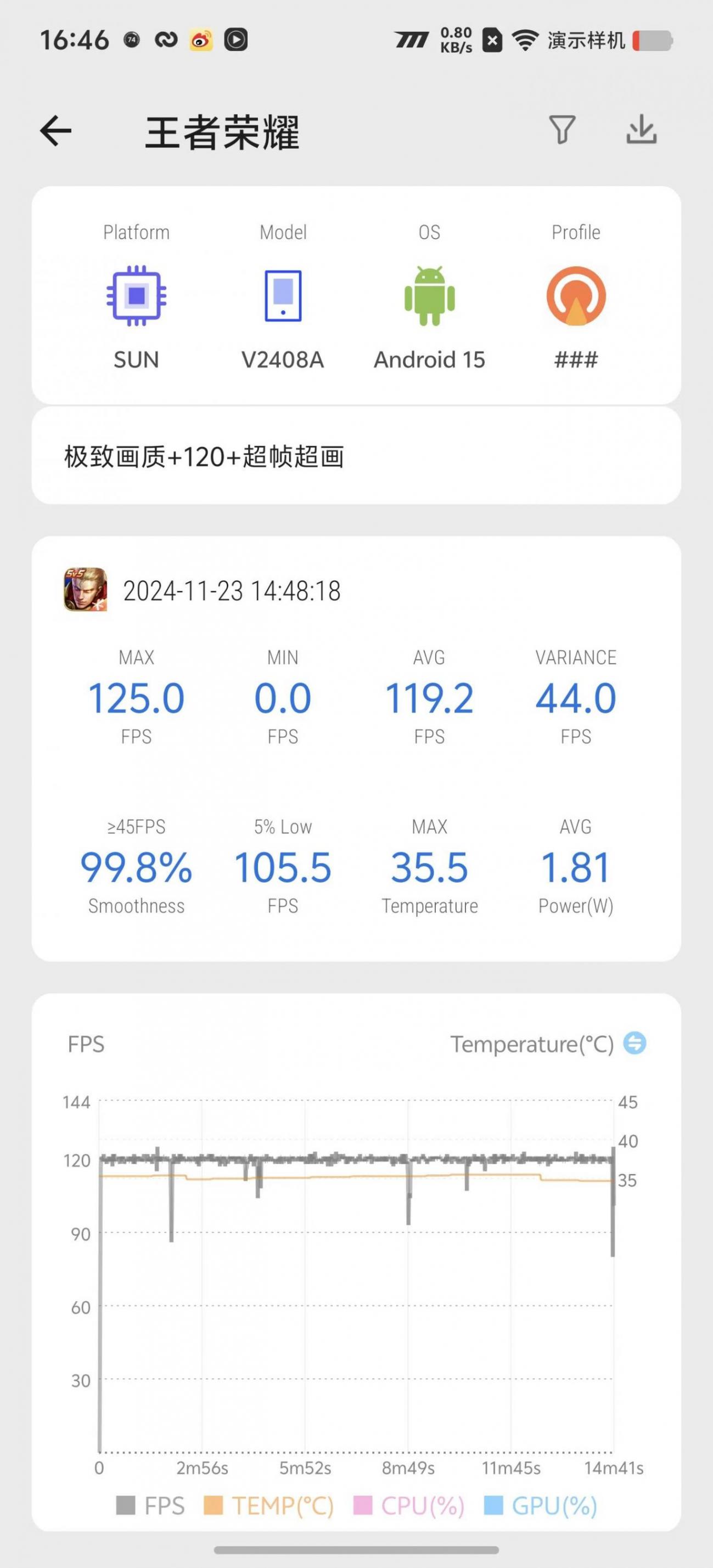 游戲會有偶爾插幀失敗掉60的現(xiàn)象,室溫25度環(huán)境溫下,基本也能保持一條直線,溫度最高也就37度不到。