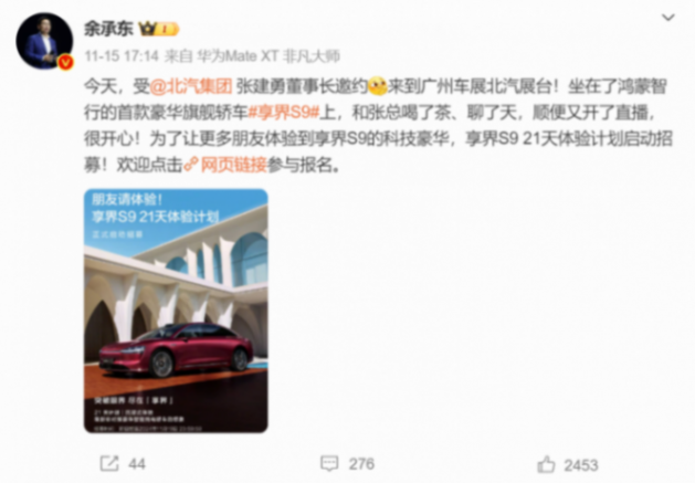乘勝要追擊,打鐵要趁熱,于是我們可以看到前兩天的廣州車展期間,華為余承東也在微博上為享界S9『拉票』,宣布開啟「享界S9 21天體驗計劃」。沒有金剛鉆,誰敢攬瓷器活。平常我們去店里試駕,大多也就個把小時,有信心讓你深度體驗21天的,不用說肯定是狠角色。