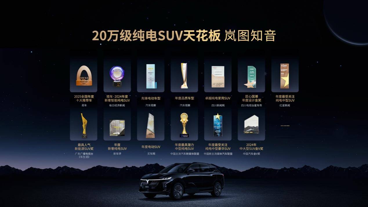 就拿關注度來說,嵐圖知音獲得“年度最具潛力中型純電SUV”“2025全國年度十大推薦車”“年度最受關注純電中型SUV”“年度新奢純電SUV”等榮譽稱謂;品質安全方面,斬獲了“年度品質車型”;智能創新方面,也獲得了“先鋒電動車型”“2024年度新智能純電SUV”“匠心國潮年度設計金獎”等權威認可……