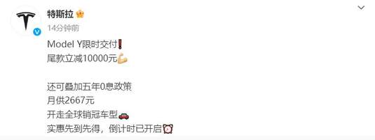 據特斯拉官方微博11月25日消息,Model Y限時交付,尾款立減10000元,還可疊加五年0息政策。特斯拉今年新一輪年底沖量模式,可能會引發其他品牌新能源汽車新一輪降價高潮。