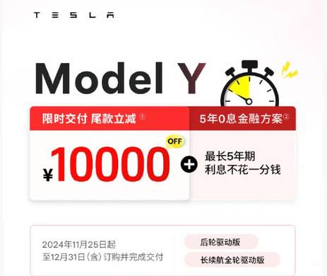 也就是說,11月25日起至12月31日,Model Y后輪驅動版和長續航全輪驅動版,兩個車型訂購并完成交付,限時優惠1萬元,還能疊加五年免息政策,首付7.99萬元,可享受最長5年免息。