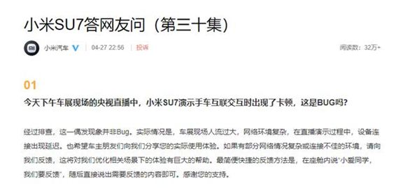 在北京車展期間,某權威媒體直播演示小米SU7車機互聯時疑似“翻車”,出現了卡頓不暢的現象。當然,小米汽車在第一時間回應“這一偶發現象并非Bug,車展現場人流過大,網絡環境復雜,在直播演示過程中,設備連接出現延遲“。