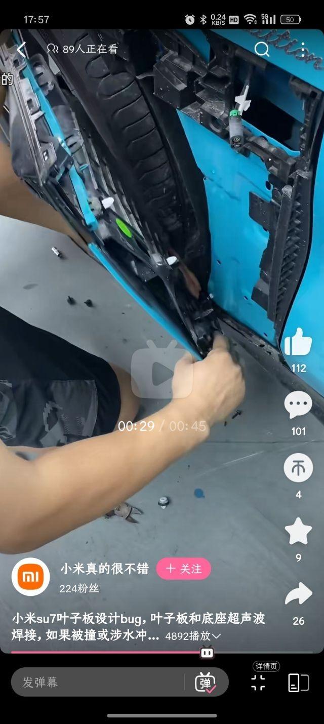 而在網絡上,我們也可以輕易搜索到關于小米SU7漆面掉漆、座椅鼓包,甚至在高速涉水路況下翼子板脫落等等問題。