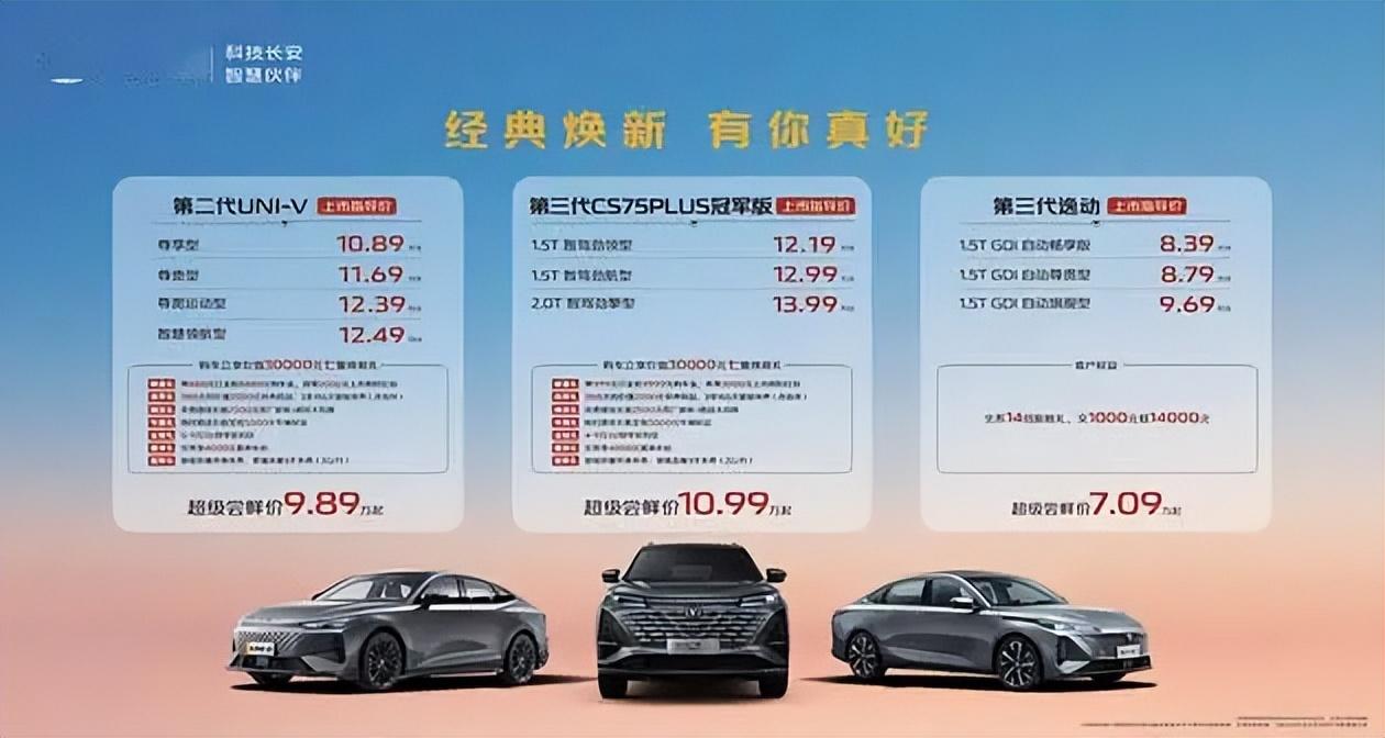 而后在3月20日長安汽車的春季煥新發(fā)布會上,第二代UNI-V、第三代逸動、第三代CS75PLUS冠軍版三車同時上市。其中,第三代CS75 PLUS冠軍版綜合優(yōu)惠下為10.99萬起,相比第三代CS75 PLUS起售價(12.49萬元)優(yōu)惠1.5萬元;第二代UNI-V頂配版比老款便宜7000元;第三代逸動上市即優(yōu)惠1.3萬,限時起售價為7.09萬。
